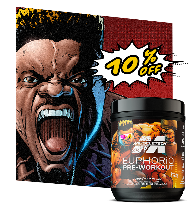 Enhanced with the highly-evolved stimulant Enfinity®, Euphoriq Pre-workout unleashes extreme levels of clean, smooth energy that fuels the Boogieman's huge lifts in the gym and powers his relentless intensity. The Boogieman also benefits from the musclebuilding power of beta alanine and betaine contained within Euphoriq, while also experiencing skin-popping muscle pumps from L-citurlline and Noolvl™.