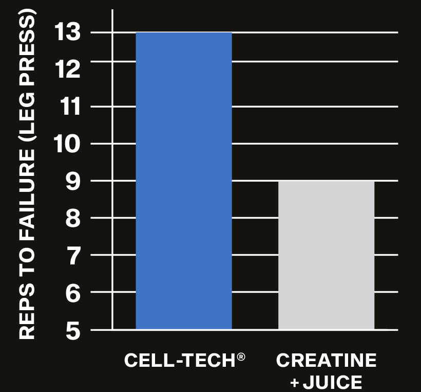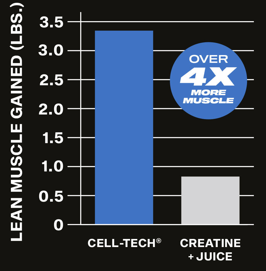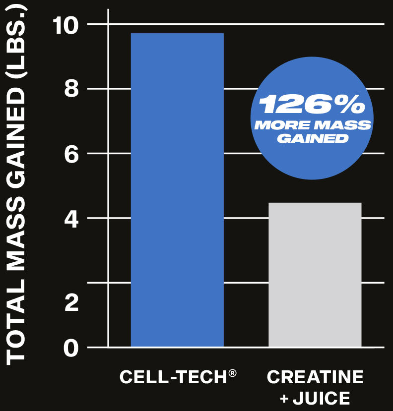 1In just 7 days, subjects using Cell-Tech’s exact formula gained an average of 3.3 lbs of lean muscle—and nearly 10 lbs of mass in just 8 weeks. No other creatine supplement is shown to deliver results this fast.