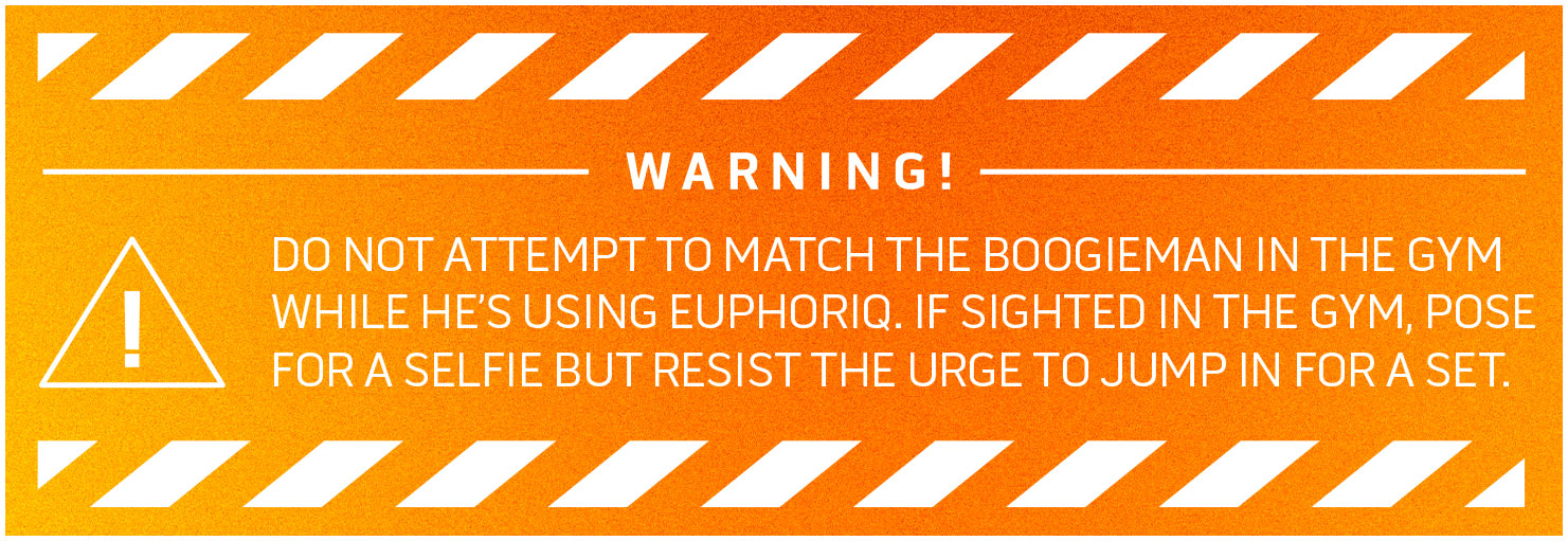 Enhanced with the highly-evolved stimulant Enfinity®, Euphoriq Pre-workout unleashes extreme levels of clean, smooth energy that fuels the Boogieman's huge lifts in the gym and powers his relentless intensity. The Boogieman also benefits from the musclebuilding power of beta alanine and betaine contained within Euphoriq, while also experiencing skin-popping muscle pumps from L-citurlline and Noolvl™.